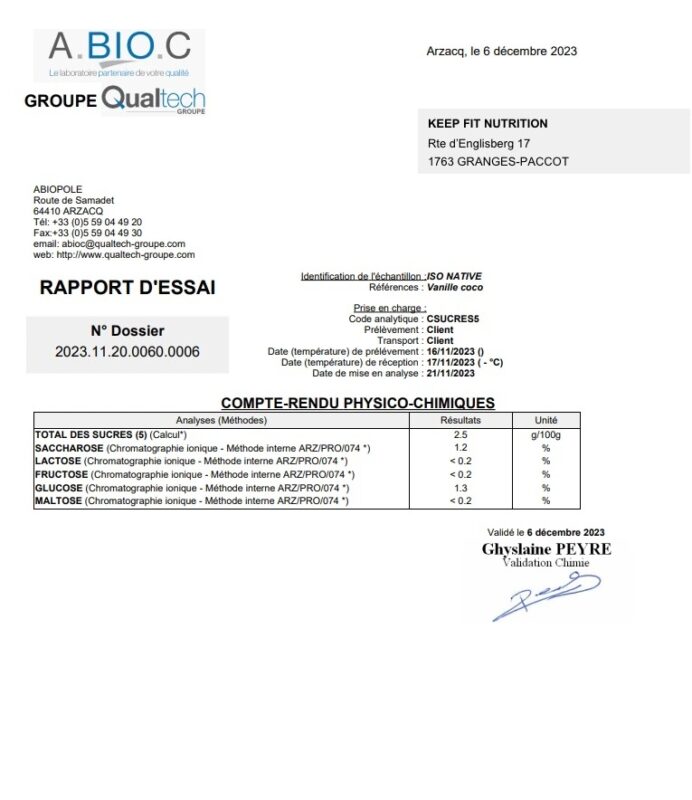 Durch gründliche Analysen stellen wir sicher, dass unser Molke-Lieferant uns tatsächlich WPI 90 Native liefert, wie es im Datenblatt des Produkts angegeben ist.