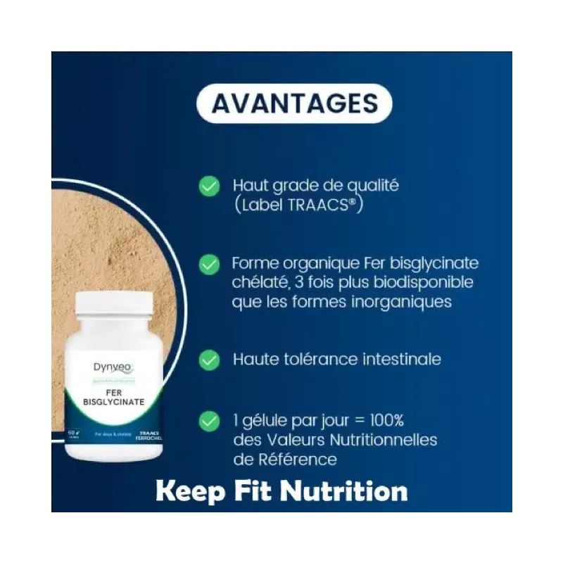 Dynveo hat ein Eisenbisglycinat mit dem Gütesiegel Ferrochel®. Dieses Nahrungsergänzungsmittel ist wirksam und verursacht keine Verdauungsbeschwerden. Eisenbisglycinat ist hochgradig bioverfügbar, um im Gegensatz zu Eisenoxid oder sulfatiertem Eisen alle seine Vorteile zu nutzen. Dieses Nahrungsergänzungsmittel Eisen wurde daher entwickelt, um den regelmäßigen Bedarf von aktiven Menschen mit Eisenmangel zu decken, aber auch für Sportler, die Ausdauersportarten *Running, Radfahren usw.* betreiben.
