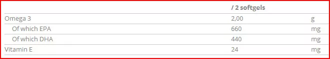Fishöl, Kapsel; Gelatine, gereinigtes Wasser, Füllstoff; Glycerin, Antioxidationsmittel; DL-alpha-Tocopherylacetat.