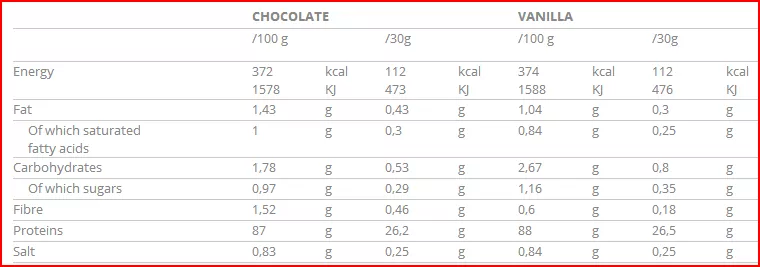 Molkeproteinisolat, *Emulgator; Sojalecithin* *Soja, Milch* 91%, Molkeproteinisolat Hydrolysat *Emulgator; Sojalecithin* *Milch 4%*, Kakaopulver 10 – 12% fettarm, Aroma, Verdickungsmittel Guarkernmehl, Salz, Süssengsmittel Sucralose.