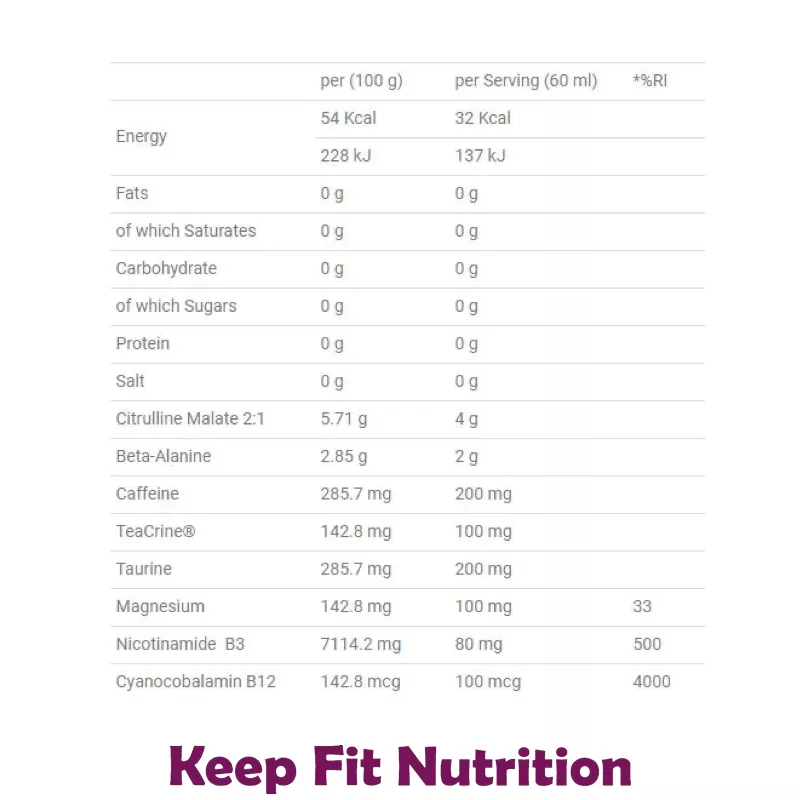 Eau, malate de citrulline, créatine monohydrate, bêta-alanine, gomme xanthane, régulateurs d’acidité *acide citrique, citrate trisodique* caféine BP anhydre, taurine, théacrine, arôme naturel, conservateurs*sorbate de potassium, benzoate de sodium*, édulcorant*sucralose* chlorure de sodium, vitamine B3*nicotinamide*, vitamine B12*cyanocobalamine*
