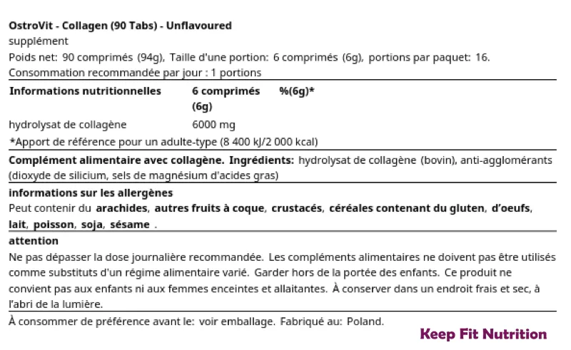 1 tablette contient 1000mg collagène bovin hydrolysé.