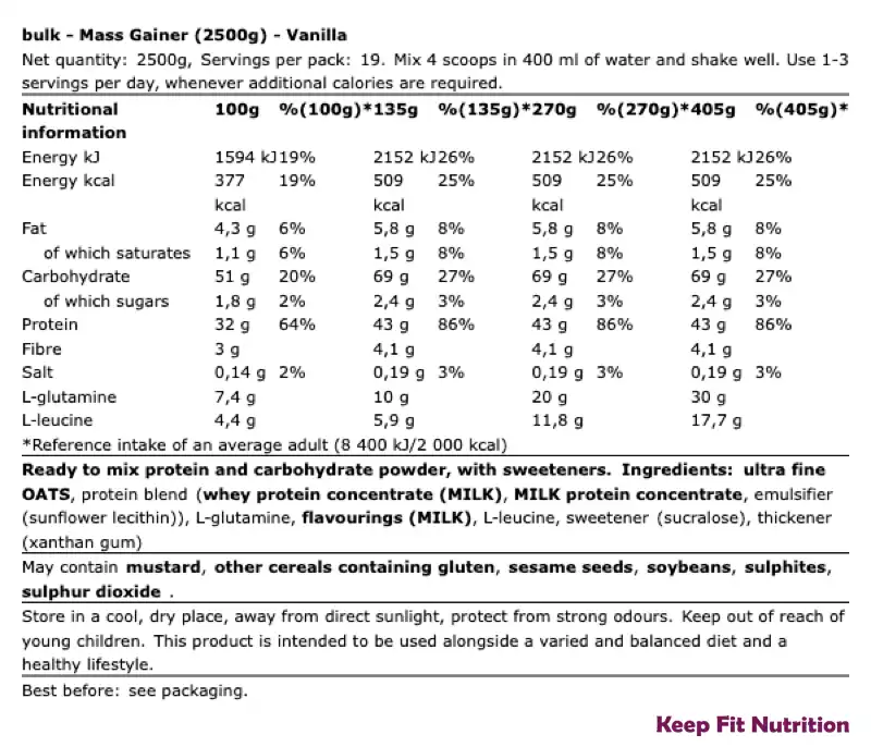 Le Mass Gainer de Bulk Nutrition contient des ingrédients qui vous aideront à stimuler et augmenter votre masse musculaire.